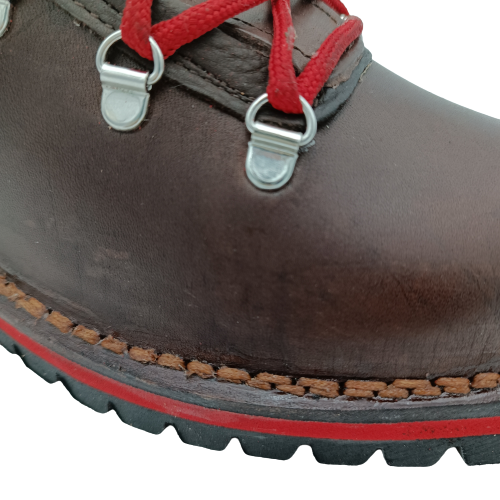 Scarpone con pellame di Toro pieno fiore che ne garantisce la massima robustezza e con uno spessore di 2.5-2.8 mm per avere la massima durata e resistenza all'acqua. Fondo Vibram per essere più duraturo e antiscivolo